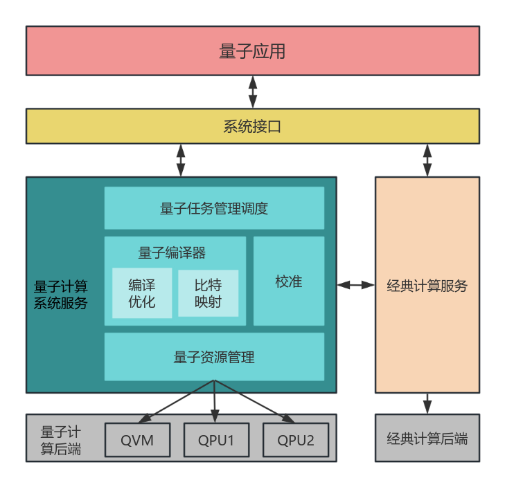 目前的量子操作系统都是运行在经典计算机上的。可以将系统服务分为量子服务和经典服务,量子服务负责处理量子任务并与量子计算后端交互。经典计算服务处理经典业务逻辑的同时,也承担初始化并监测量子设备。